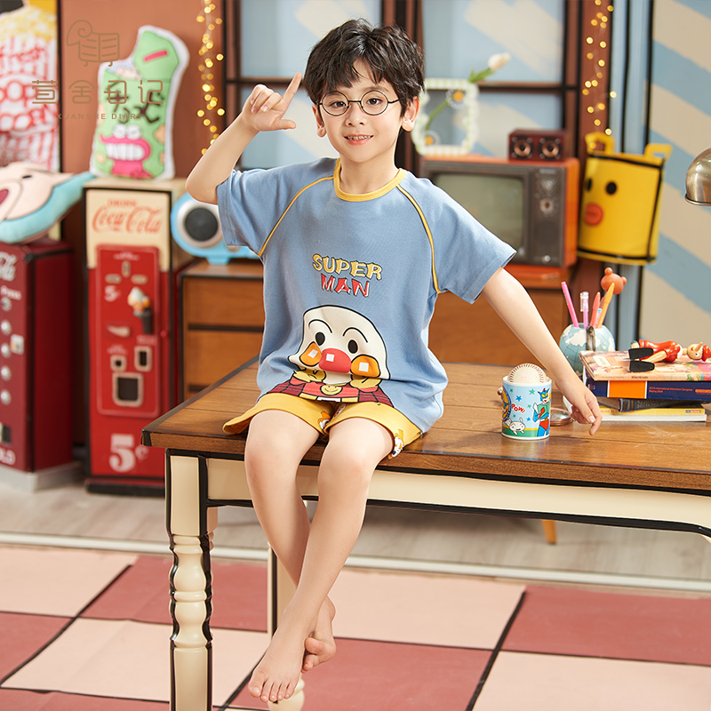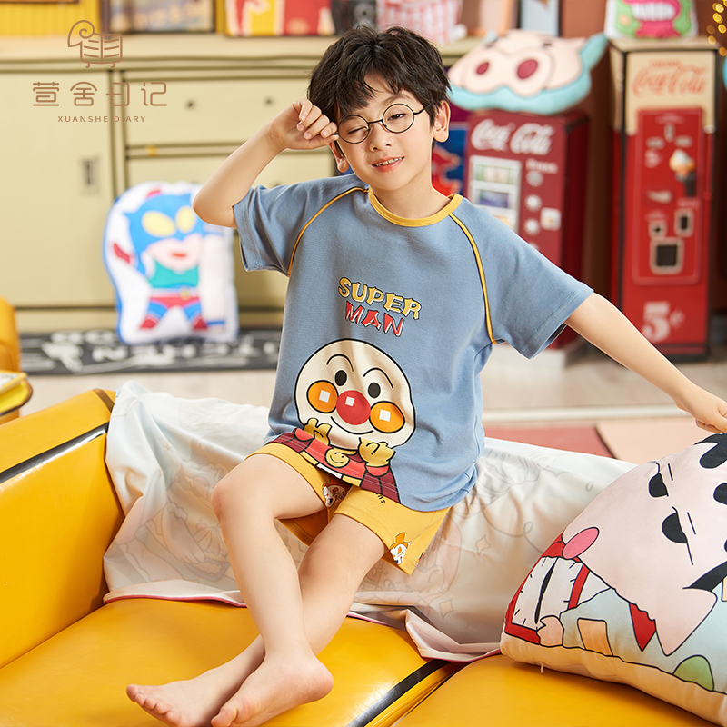 Child Pyjamas Boy Summer Short Sleeve Pure Cotton Cartoon Thin Little Boy Great Boy Baby Summertime Home Suit Suit