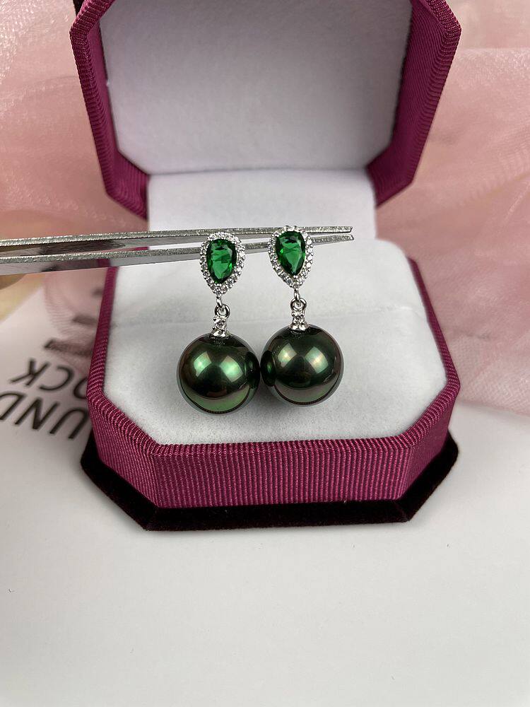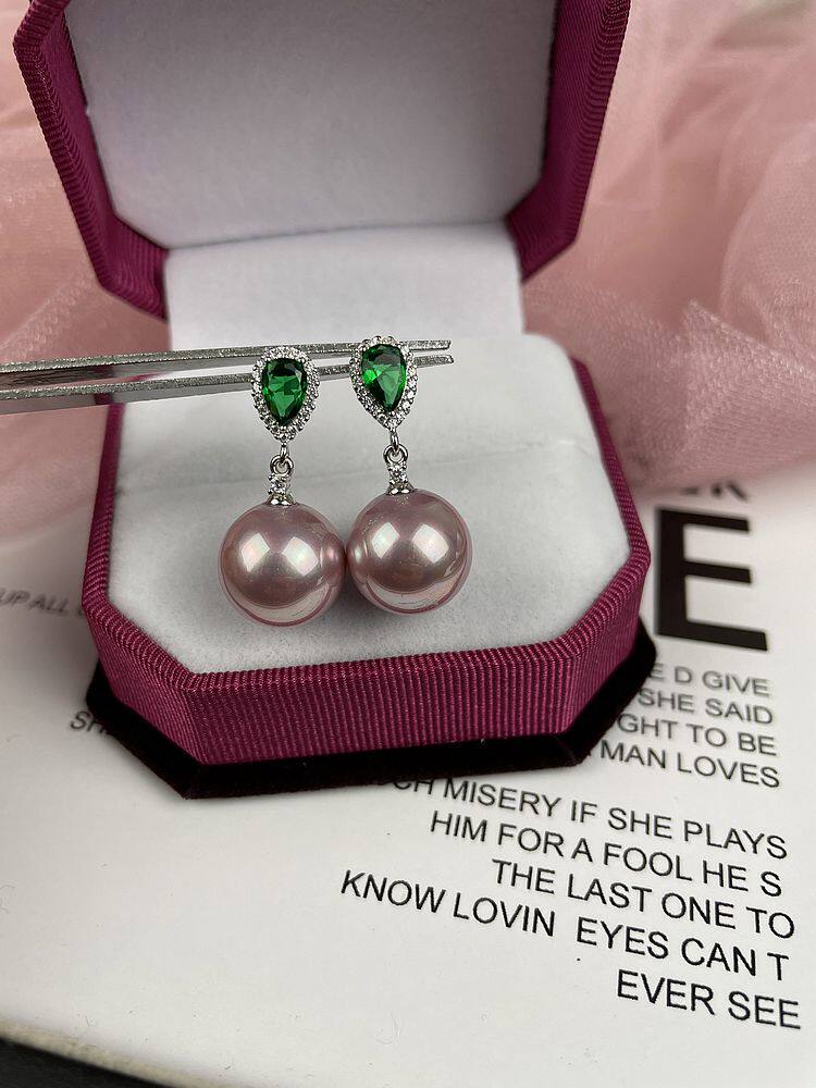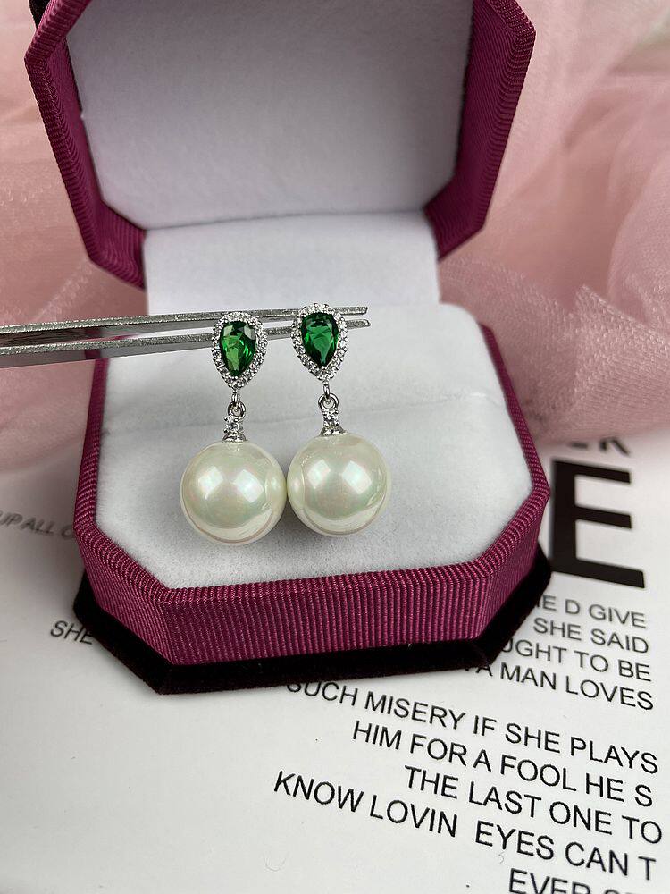Silver zircon malach green 12mm pearl stud earrings