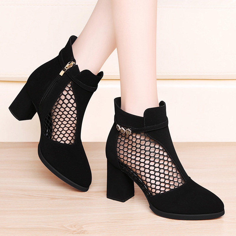 Mesh boots women's hollow thick heel mesh boots 2023 spring and autumn new black sandals single boots thin high-heeled short boots