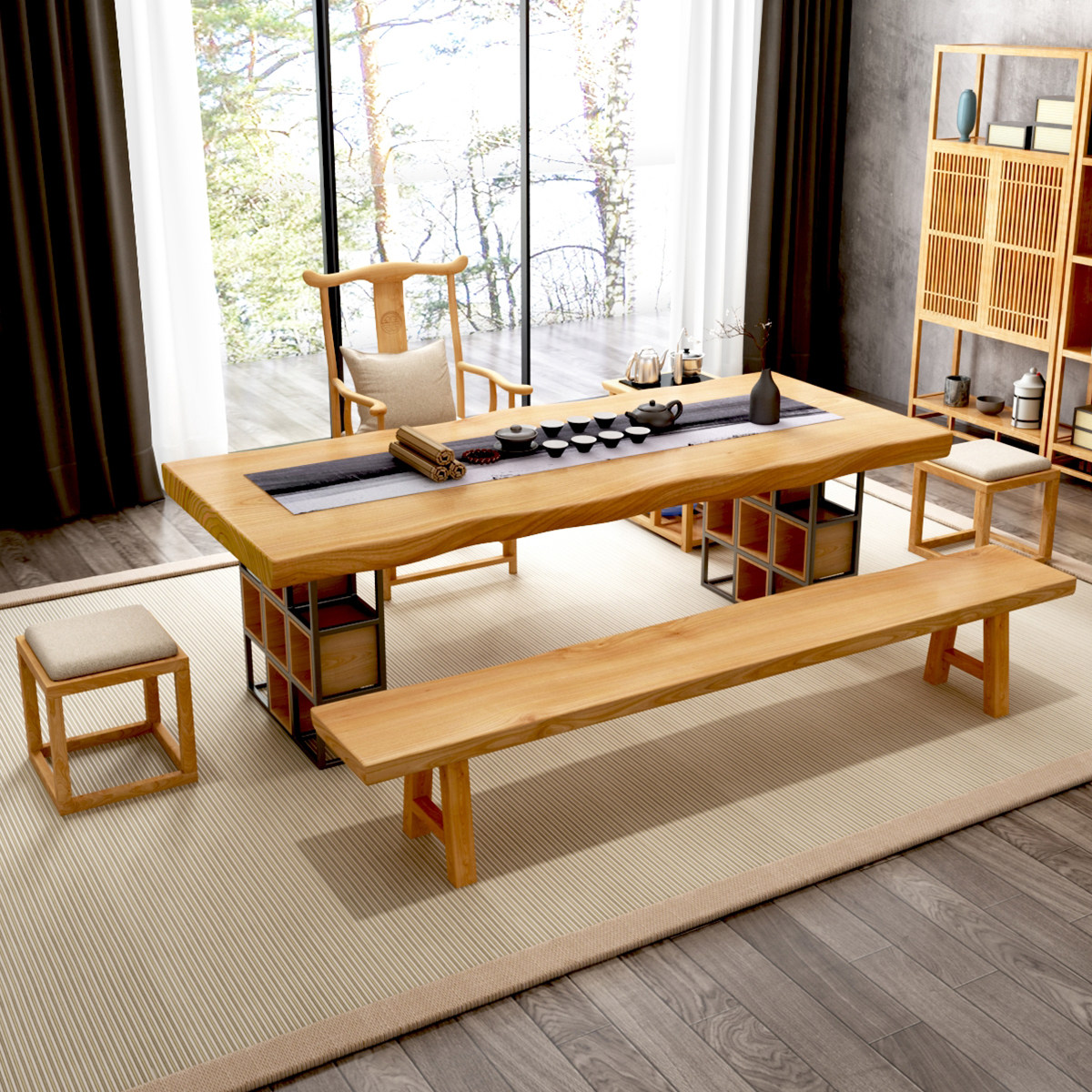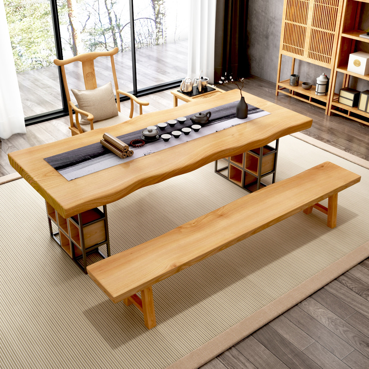 New Chinese board tea table and chair combined Solid wood office tea table Zen tea table log household tea table