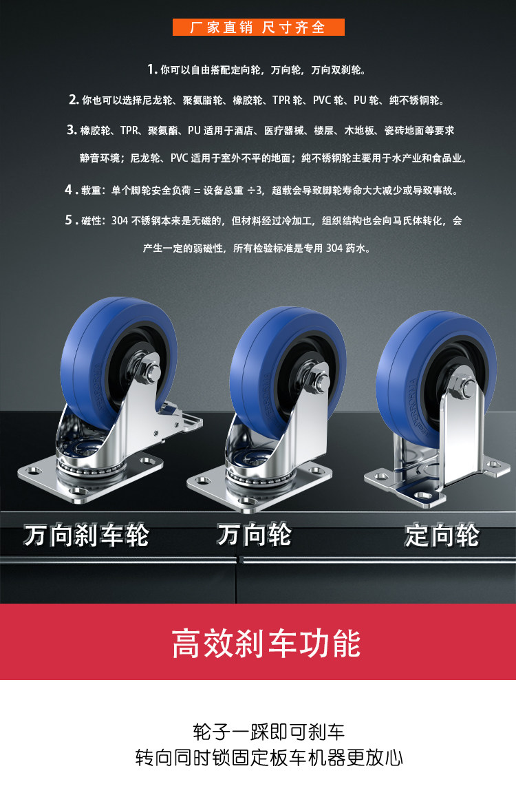 3-inch directional wheels 3-inch universal wheels 3-inch universal wheels with brakes 4-inch directional wheels 4-inch universal wheels 4-inch universal wheels with brakes 5-inch directional wheels 5-inch universal wheels 5-inch universal wheels with brakes