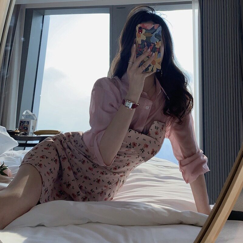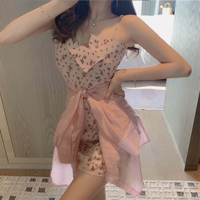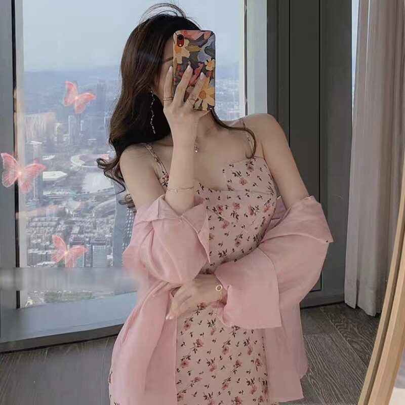 Early autumn 2021 new waist slim pink temperament sexy cardigan suspender floral dress two-piece dress
