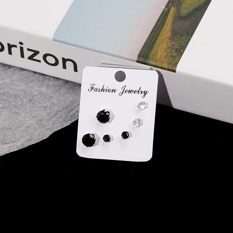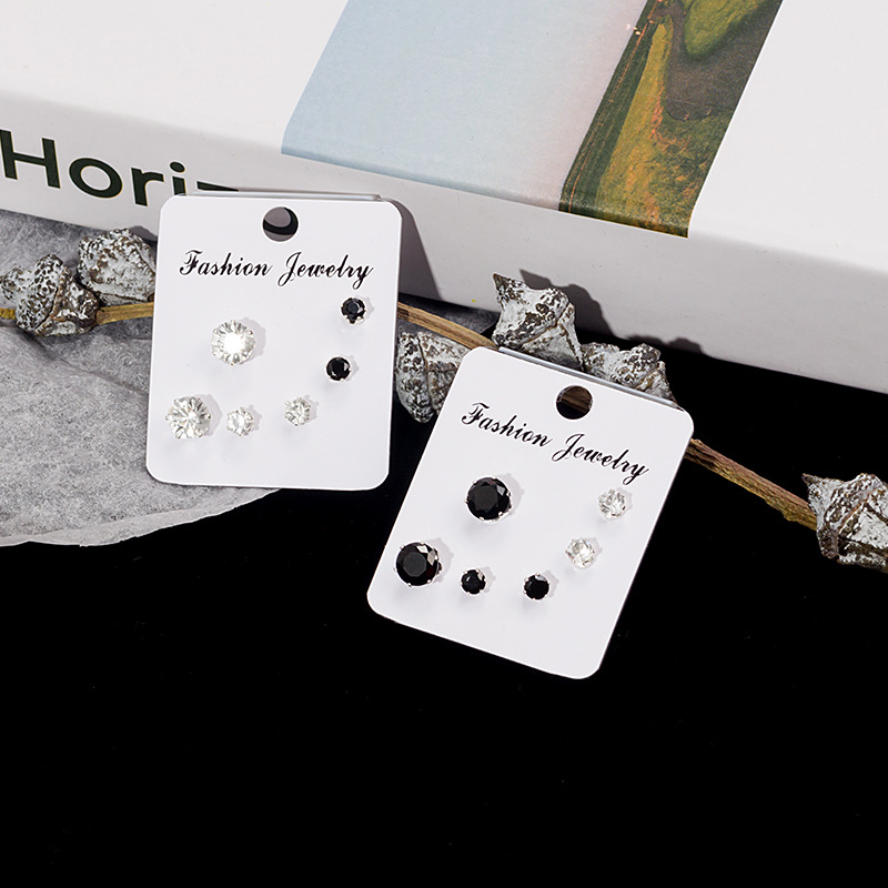 Japanese and Korean simple geometric diamond earrings set men and women exquisite temperament 3 pairs of black and white combination small zircon earrings