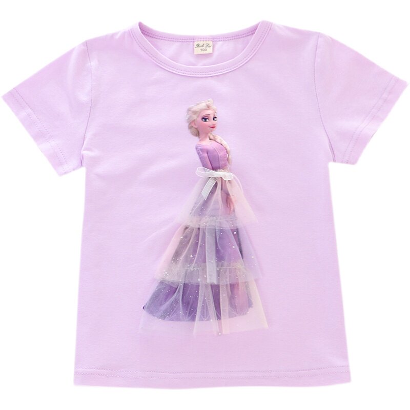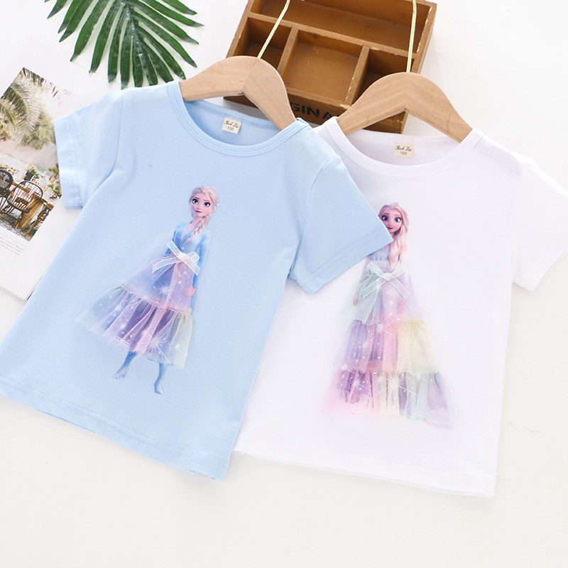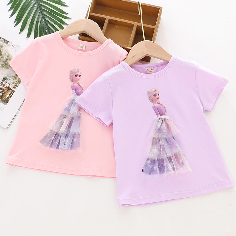 Children's clothing 2022 new Summer girls T-shirts Bottoms Shirts Children Cartoon Solid Princess Progressive web yarn blouses