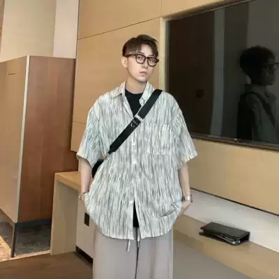SC 21 summer printed strip short-sleeved shirt men's Hong Kong style ins Korean version of the trend loose and all-match high-end hanging flower shirt
