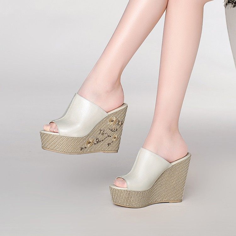 Beige leather wedge heel one-word slippers women's round head ultra-high thick-heeled thick-soled sandals spring and summer hate the sky high women's shoes trend