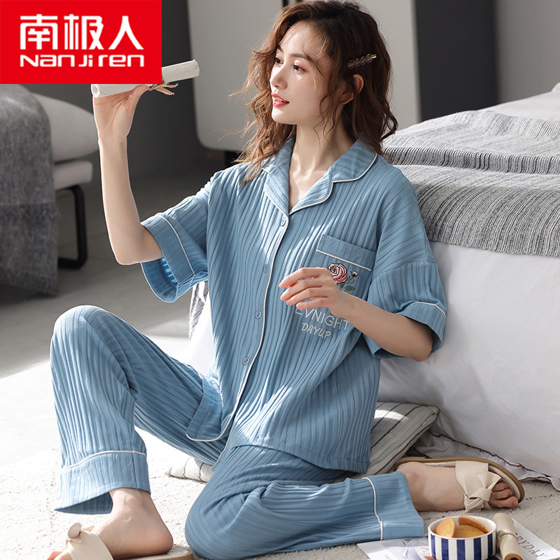 Antarctic pyjamas 2022 new summer pure cotton short sleeve long pants plus fattening up a thin family home suit suit
