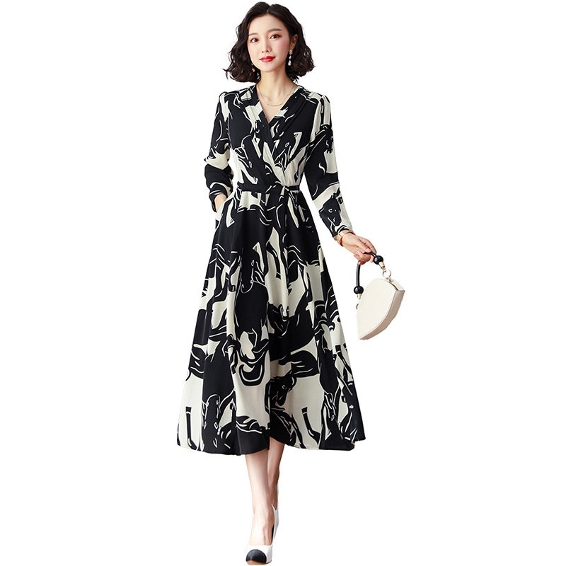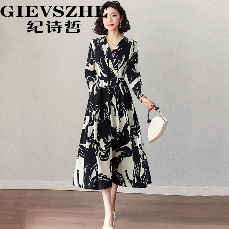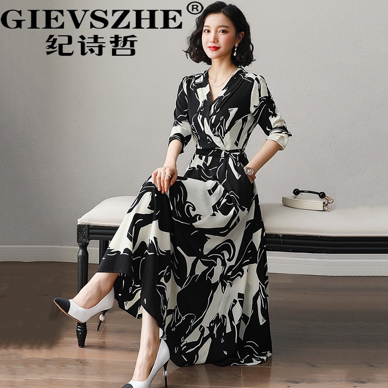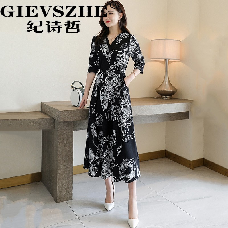 Ji Shizhe dress women 2022 new spring high-end black Floral Chiffon waist thin temperament V-neck
