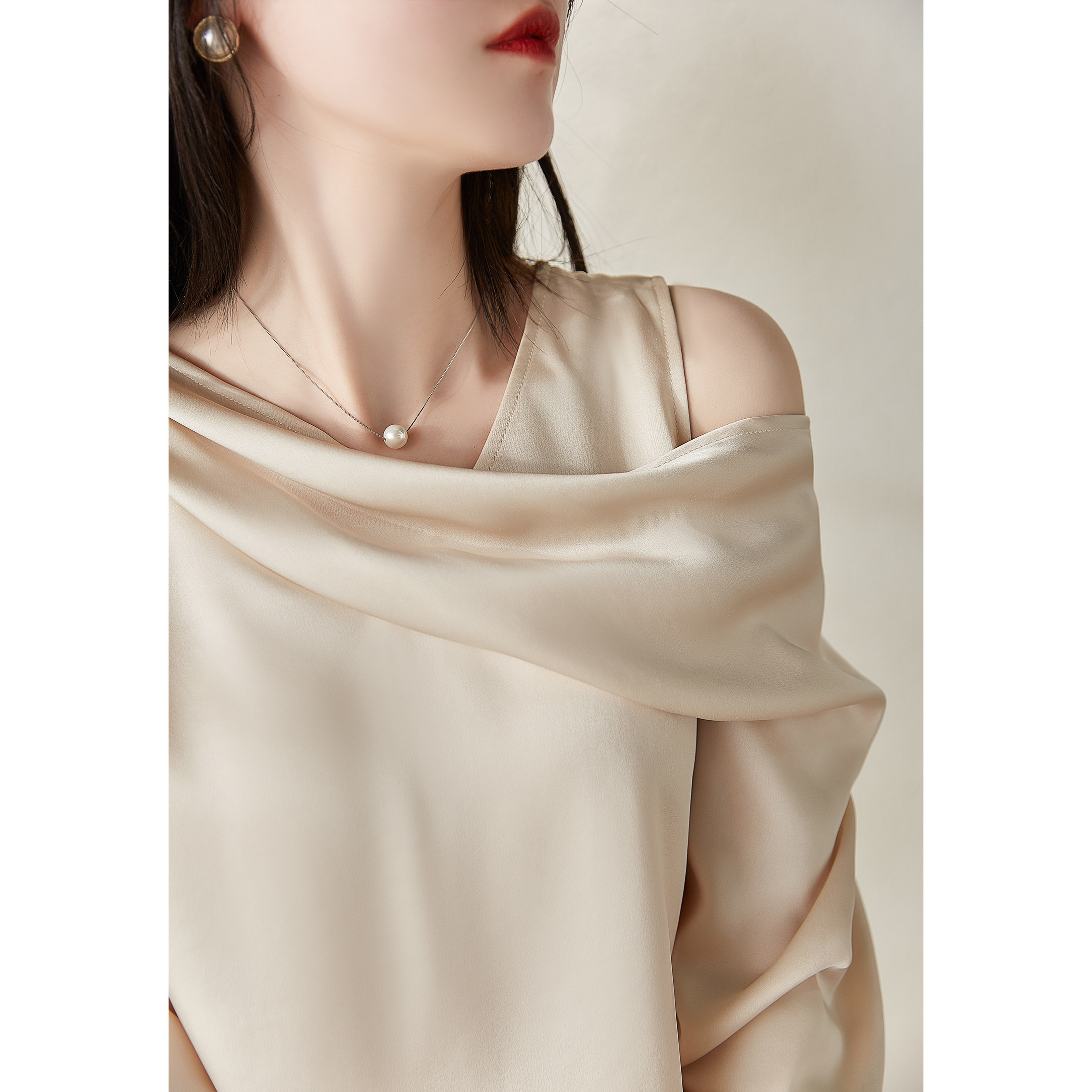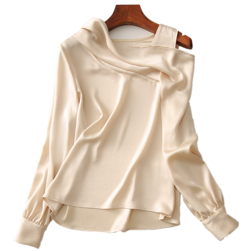 い Temperament and glossy asymmetrical cut off-the-shoulder collar smooth drape acetate satin shirt ELCY41491