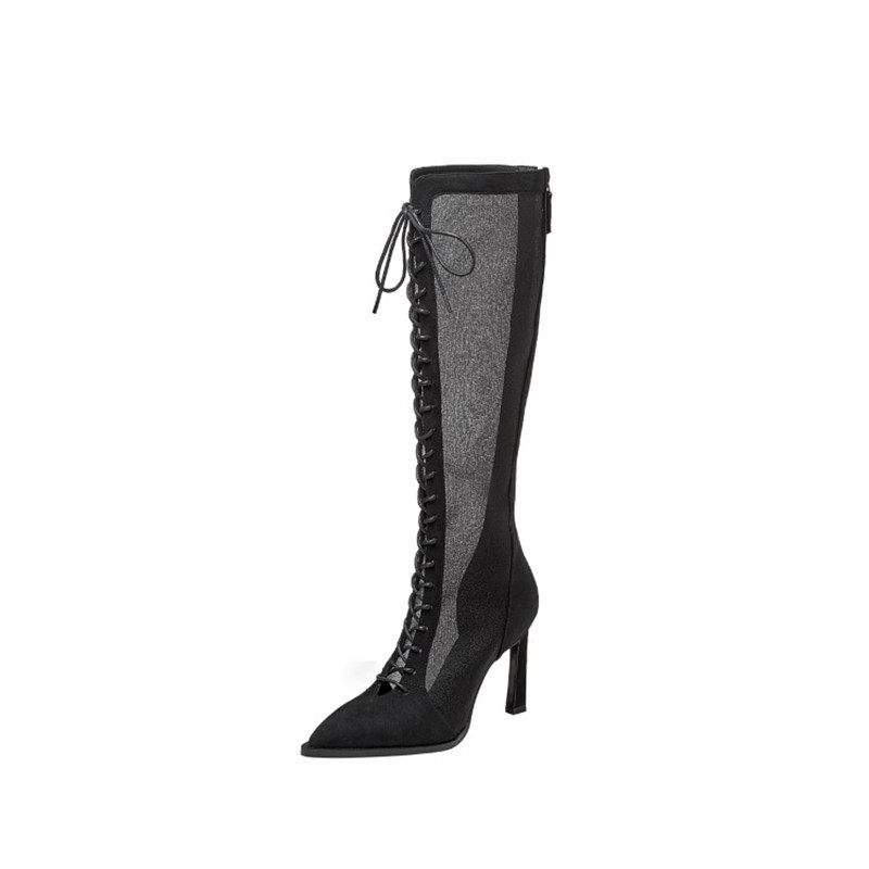 Leather pointed toe stiletto high-heeled mesh boots hollowed-out mesh boots women's summer sexy high-barrel cool boots look thin strappy boots