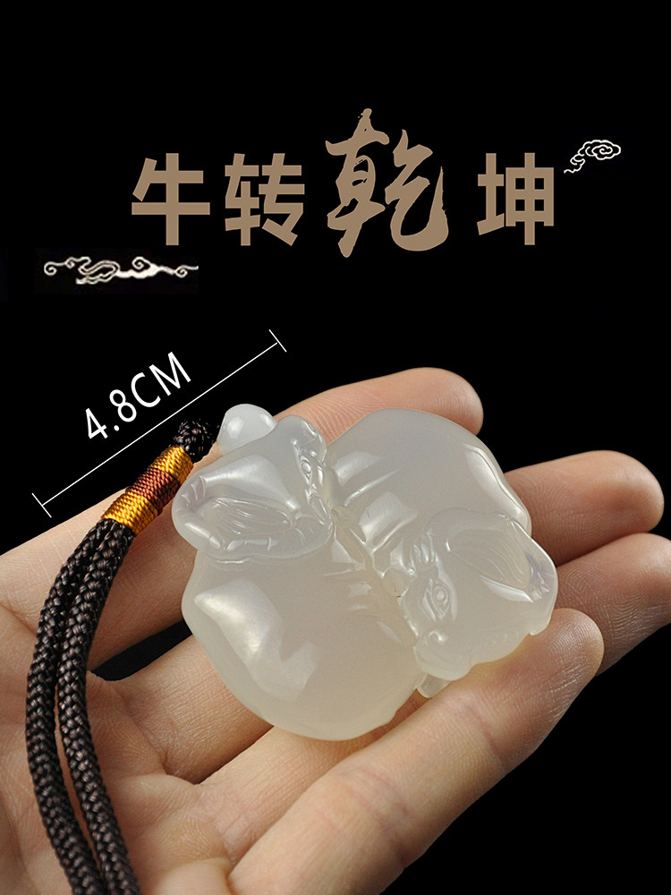 Natural jade agate raw stone sculpted cow turn dry Kun men and women carry out a piece of jade medullary handle piece text with a hand piece