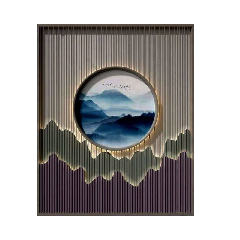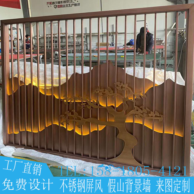 Custom stainless steel landscape black titanium alloy brushed screen rose gold rockery metal hotel living room compartment background wall