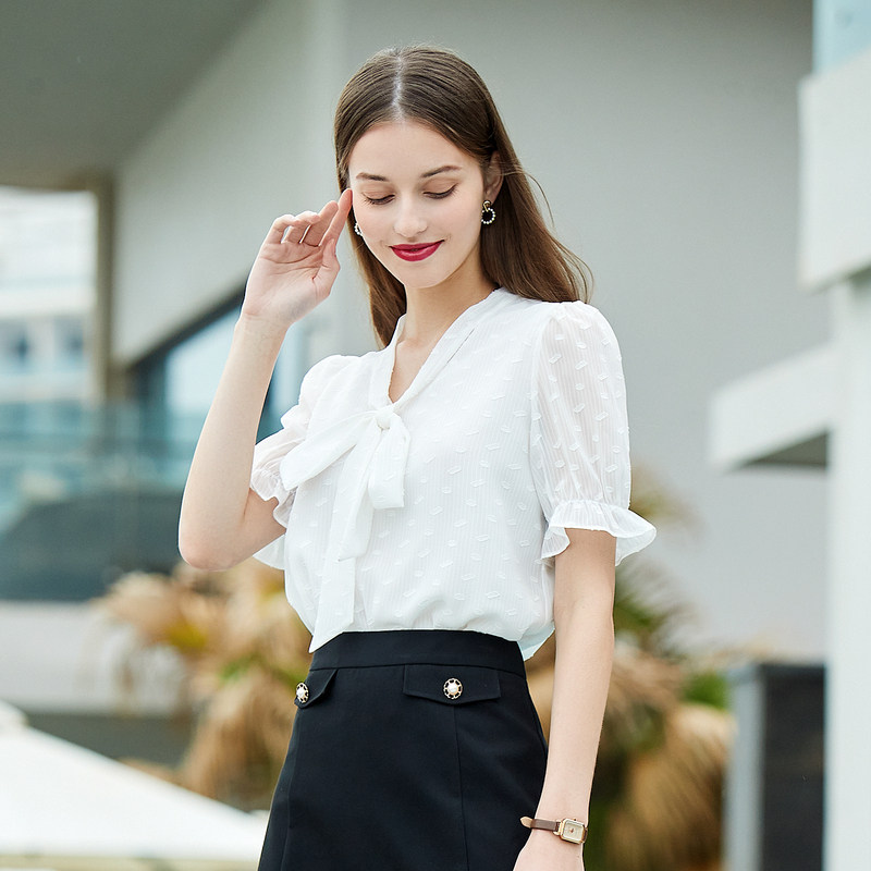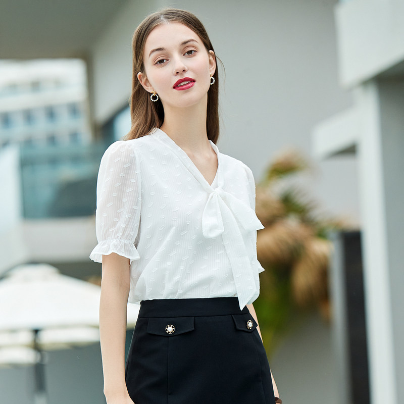 100 pictured bow tie strap white shirt woman gentle wind short sleeve snow-spinning shirt 2022 Summer new lining