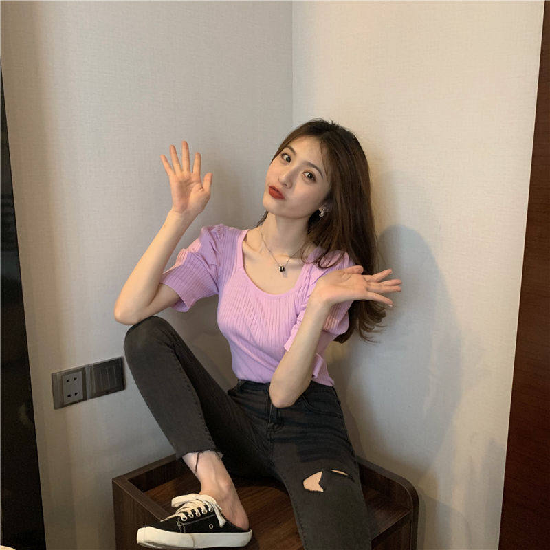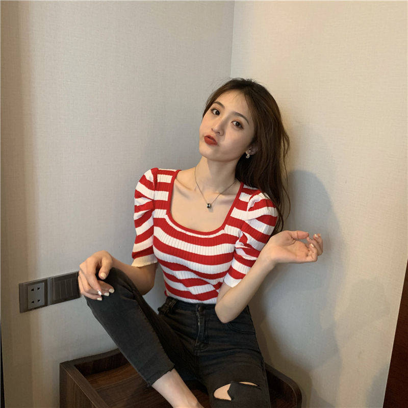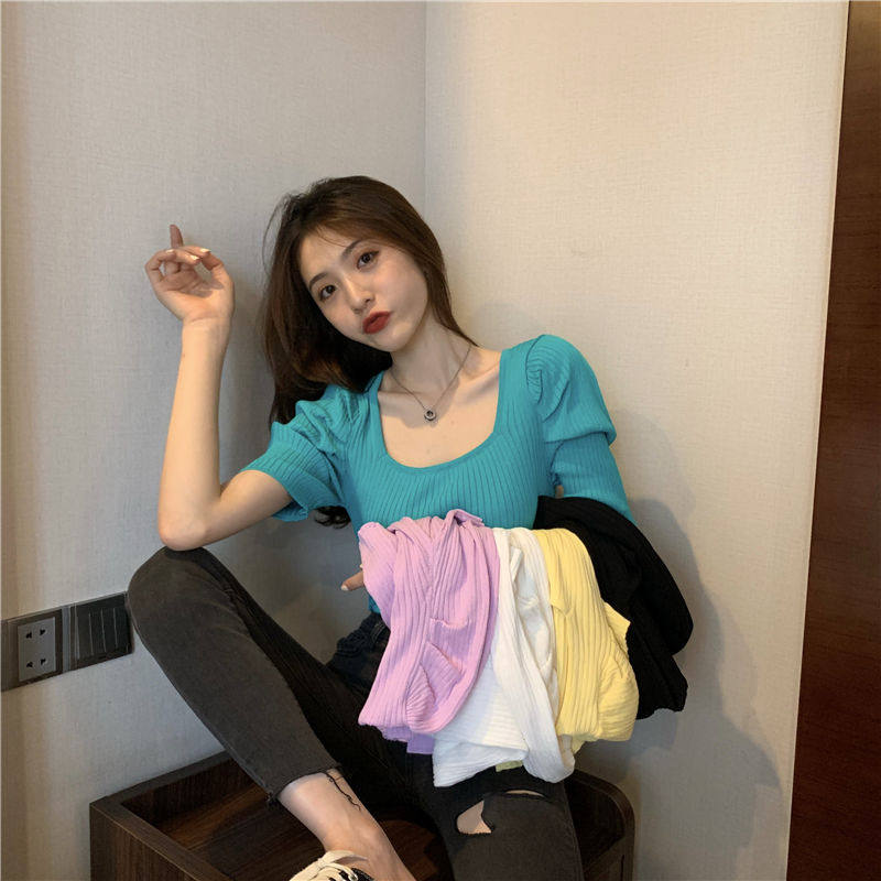 Summer 2022 new retro port Taste Bubble cuff square collar Slim Fit Slim short sleeves Knitted Sweatshirt Blouse Women Dress