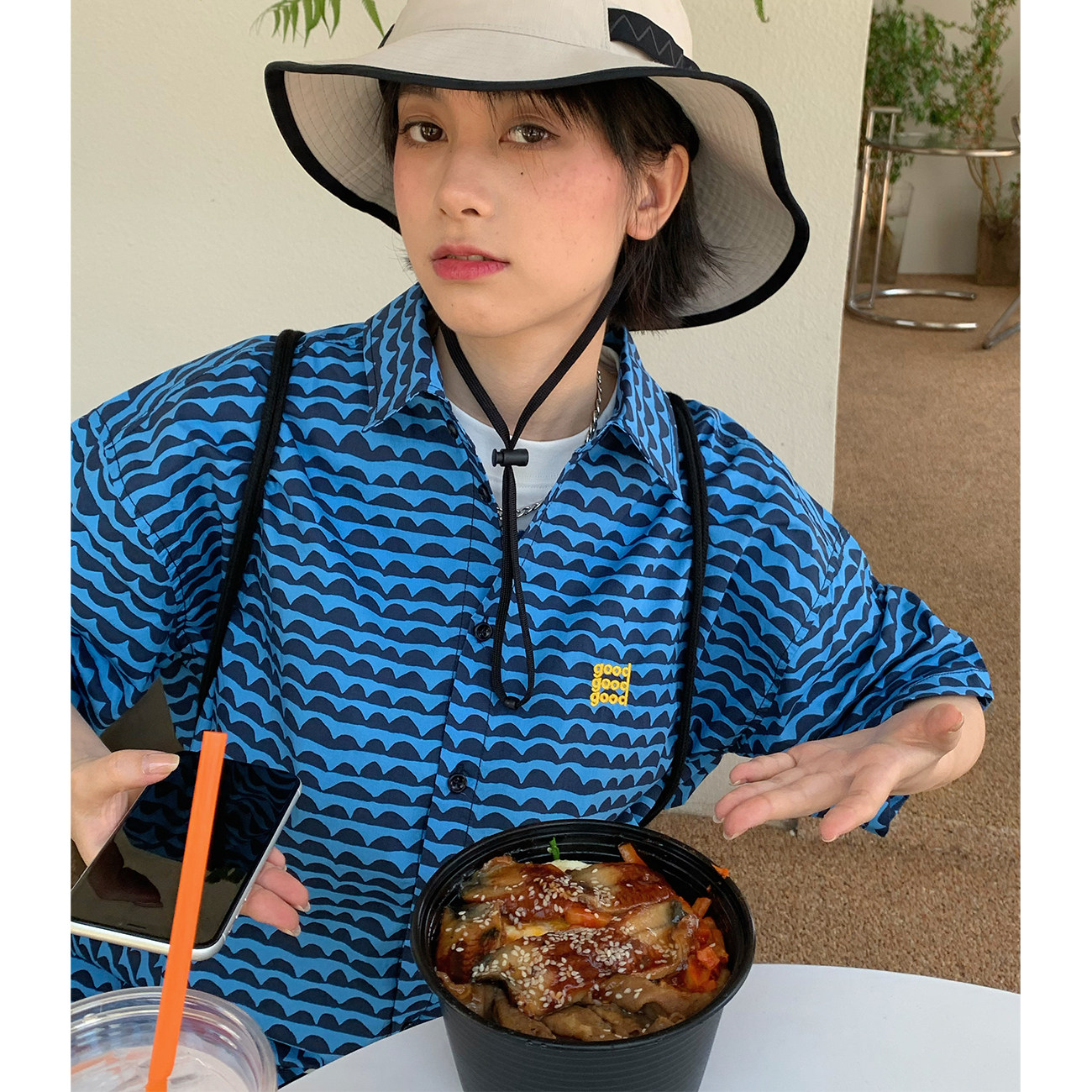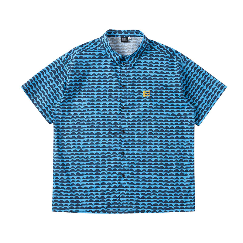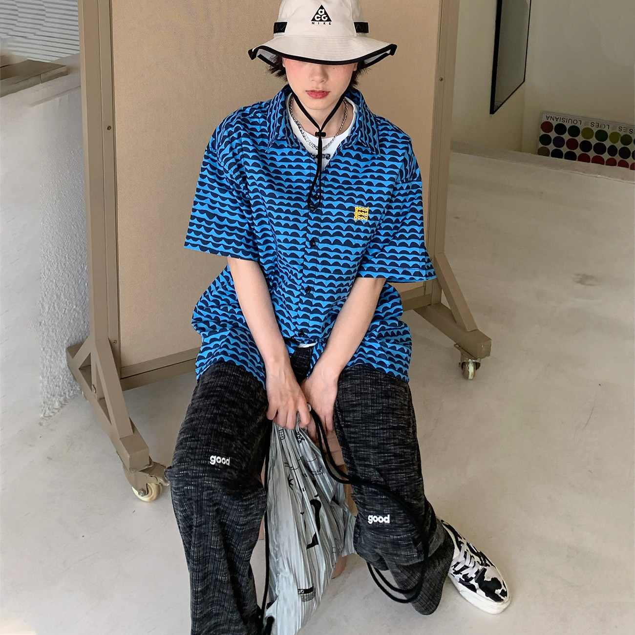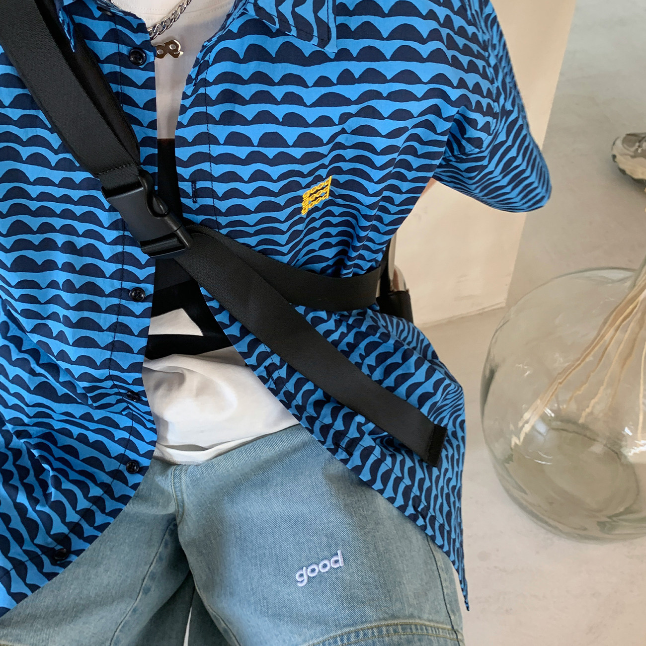 Nice store MeihaoStore Blue Black Wavy Grain Good Embroidery Loose Stack Wear Casual Short Sleeve Shirt Man