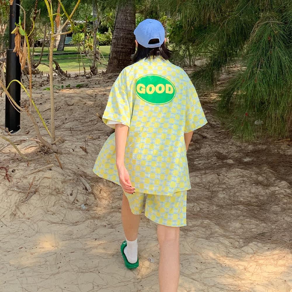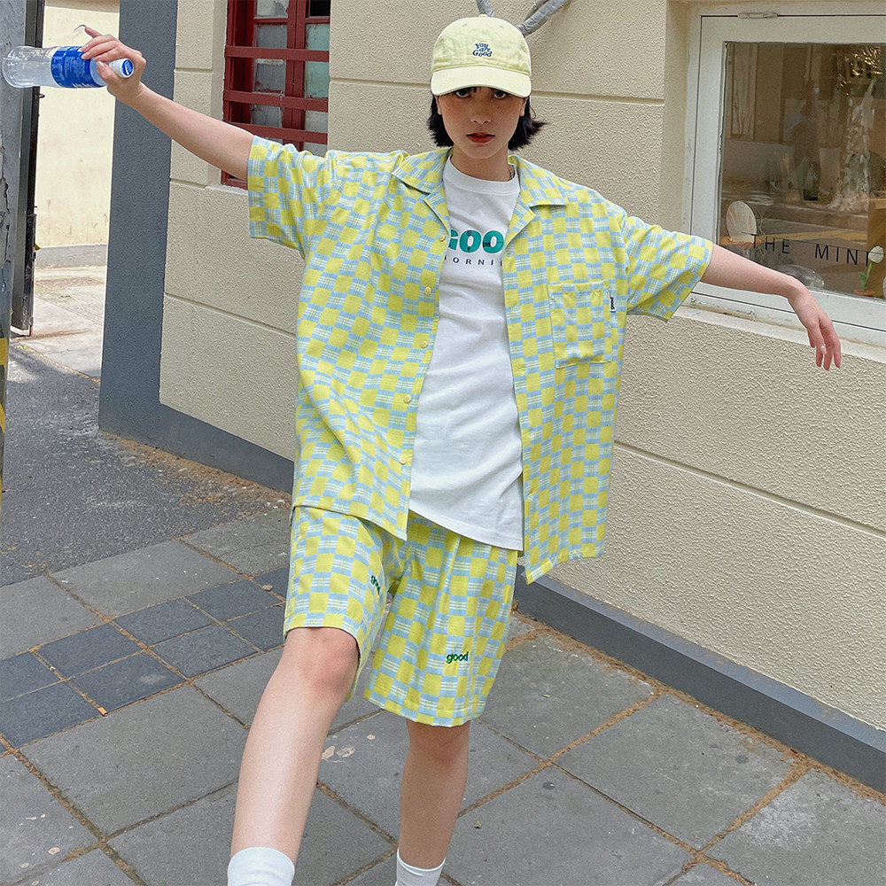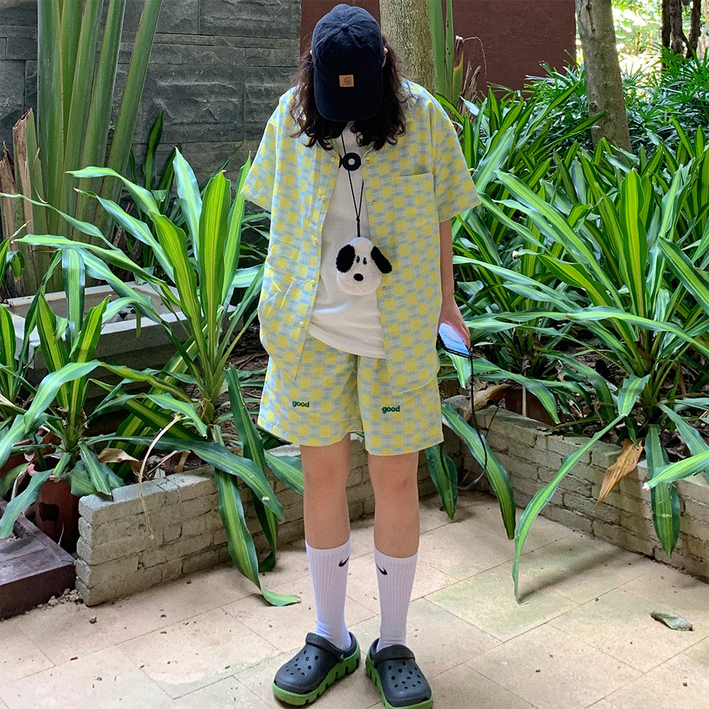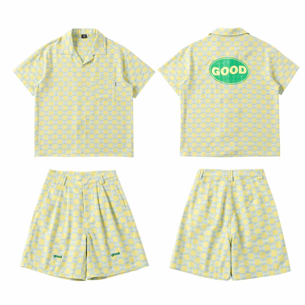 Nice store MeihaoStore yellow blue plaid good embroidery printed retro short sleeve shirt shorts suit