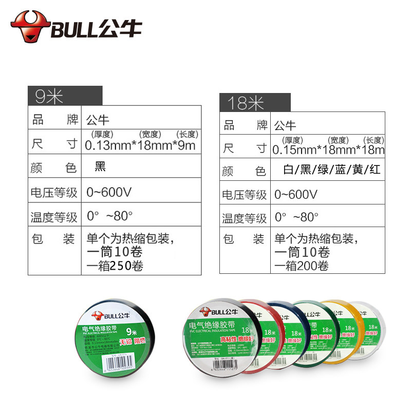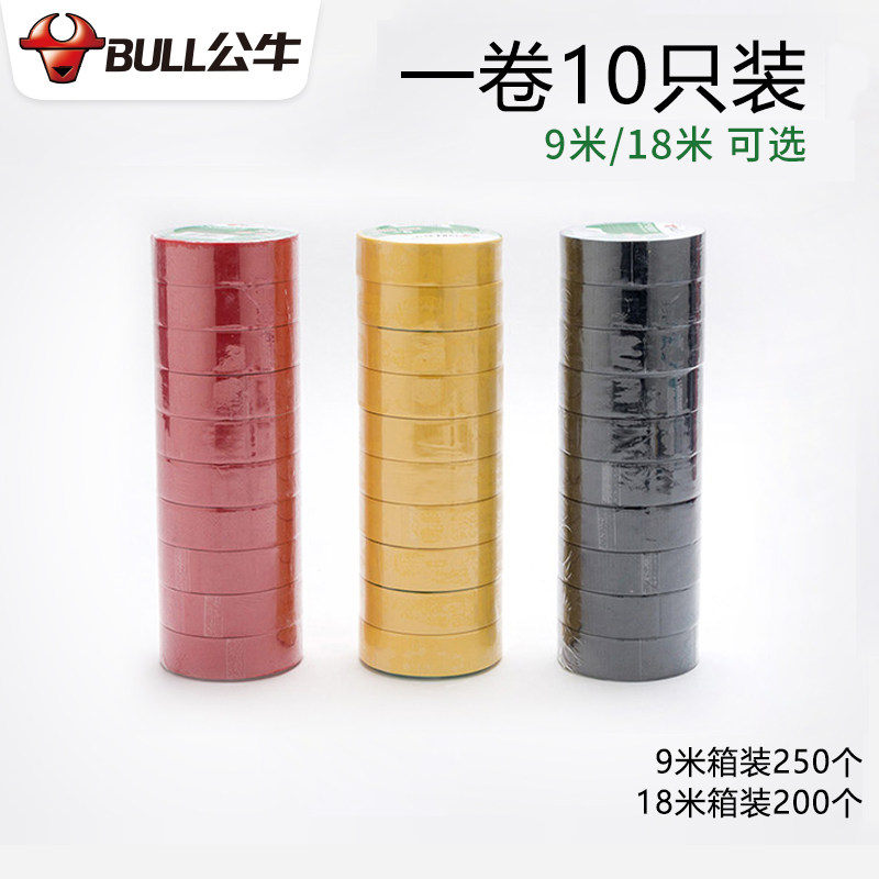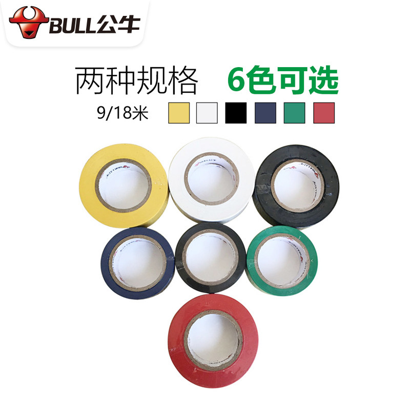 Bull electrical tape Electrical tape PVC insulation tape Flame retardant low temperature resistance 9 18 meters black yellow white waterproof