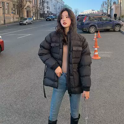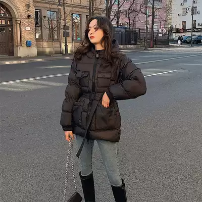 Waist-closing down cotton clothes women's medium and long version 2021 tooling belt small hooded thickened thin cotton coat jacket winter