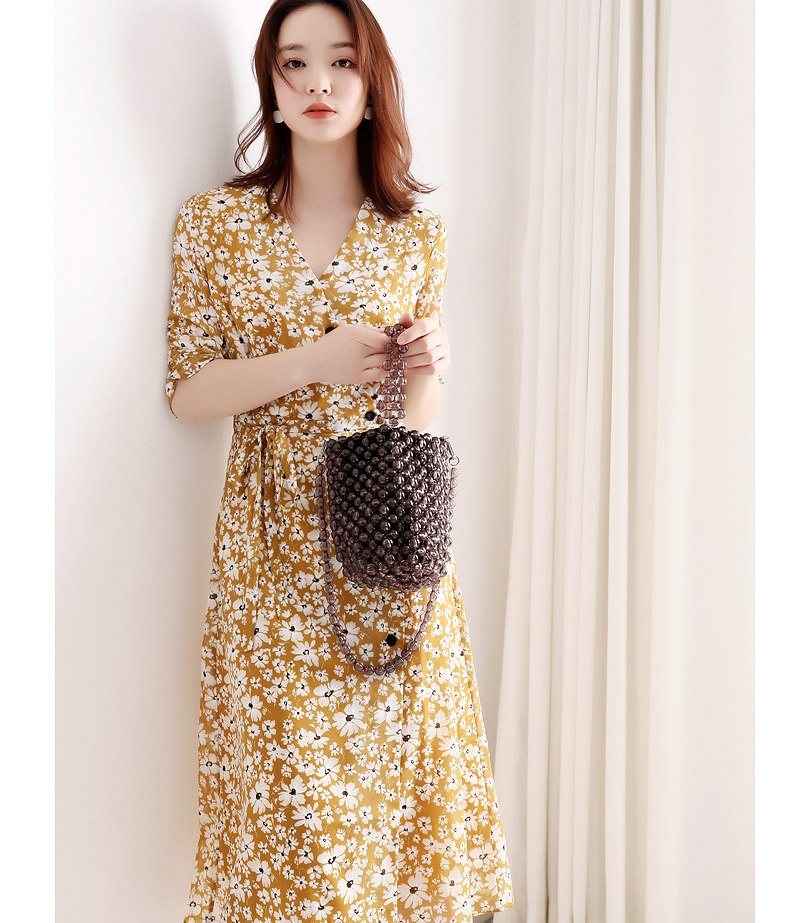 Hong Kong counter summer 2021 New Platycodon grandiflorum flower dress women waist thin temperament chiffon Medium-length dress