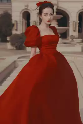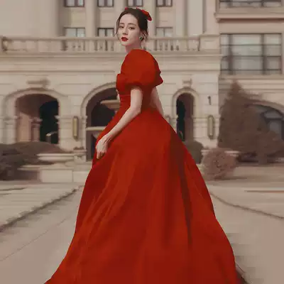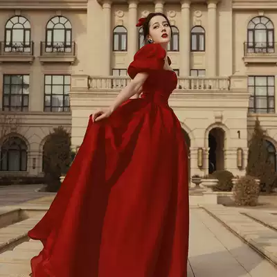 Toast, bride, summer red satin, high-set fairy, engagement dress, French evening dress, big size, fat mm