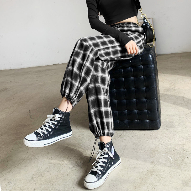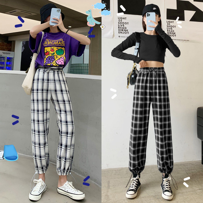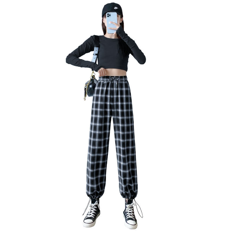 Black and white plaid pants women's pants summer thin section loose wide leg pants Net red casual ice silk nine-point sports drawstring pants