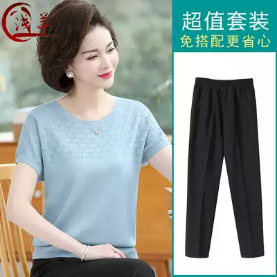 Mom summer dress Western style two-piece top middle-aged women's clothes large size middle-aged and elderly short-sleeved ice silk T-shirt suit
