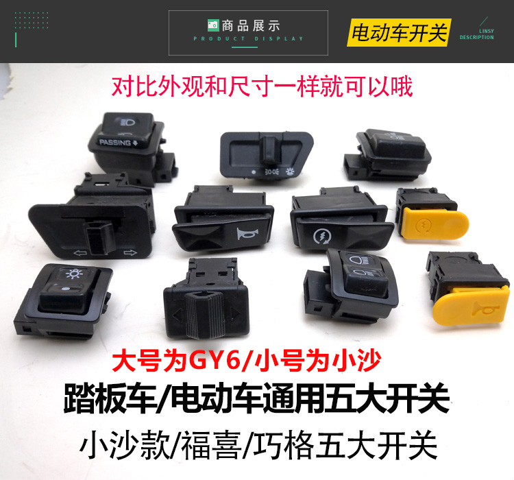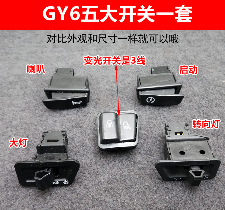 Five Top Switch Set (with three-plug-in-light) Five Top Switches Set (Fit Four Interchanged Light) GY6 Headlight Switch GY6 Steering Switch GY6 Start Switch GY6 Horn Switch GY6 Triple Interchanges