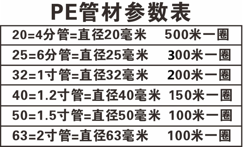 16pe pipe whole volume 500 meters 20pe pipe whole volume 500 meters 25pe pipe whole volume 300 meters 32pe pipe whole volume 200 meters 40pe pipe whole volume 150 meters 50pe pipe