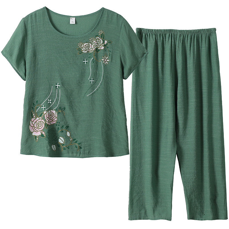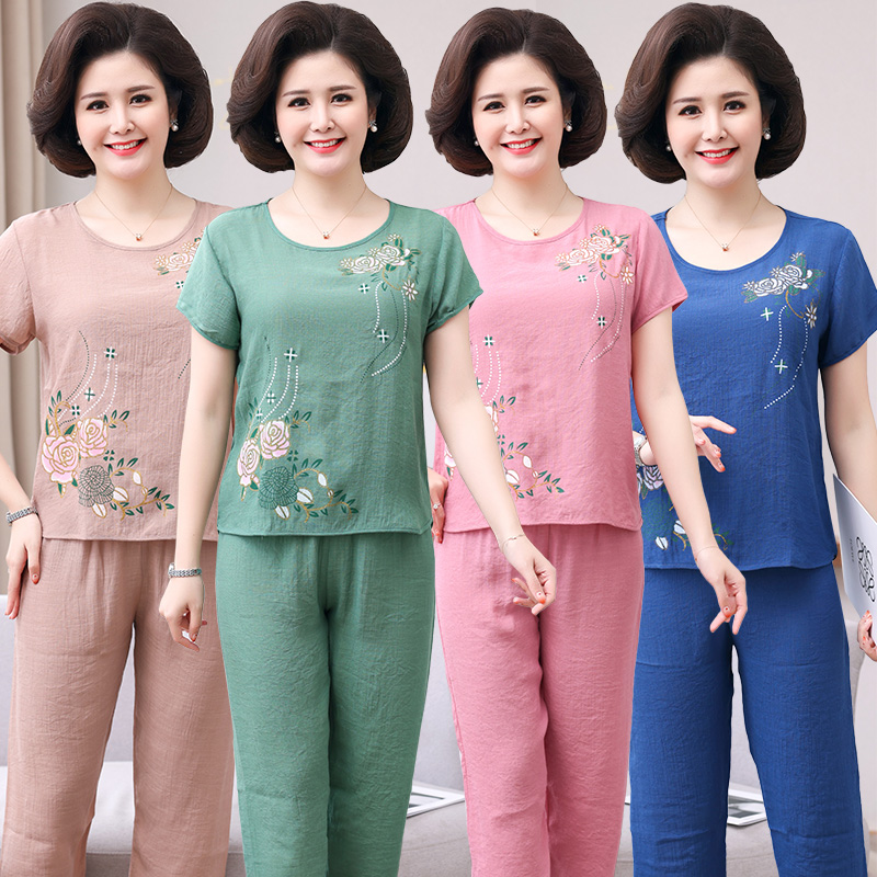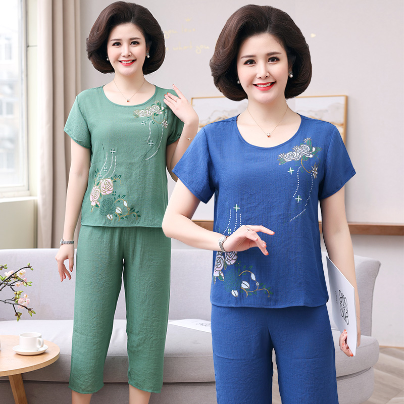 Mom pajamas women's summer short-sleeved cotton hemp middle-aged women thin cotton hemp summer large size printed two-piece set