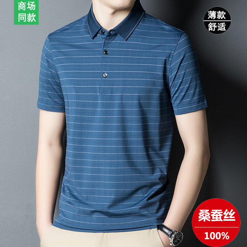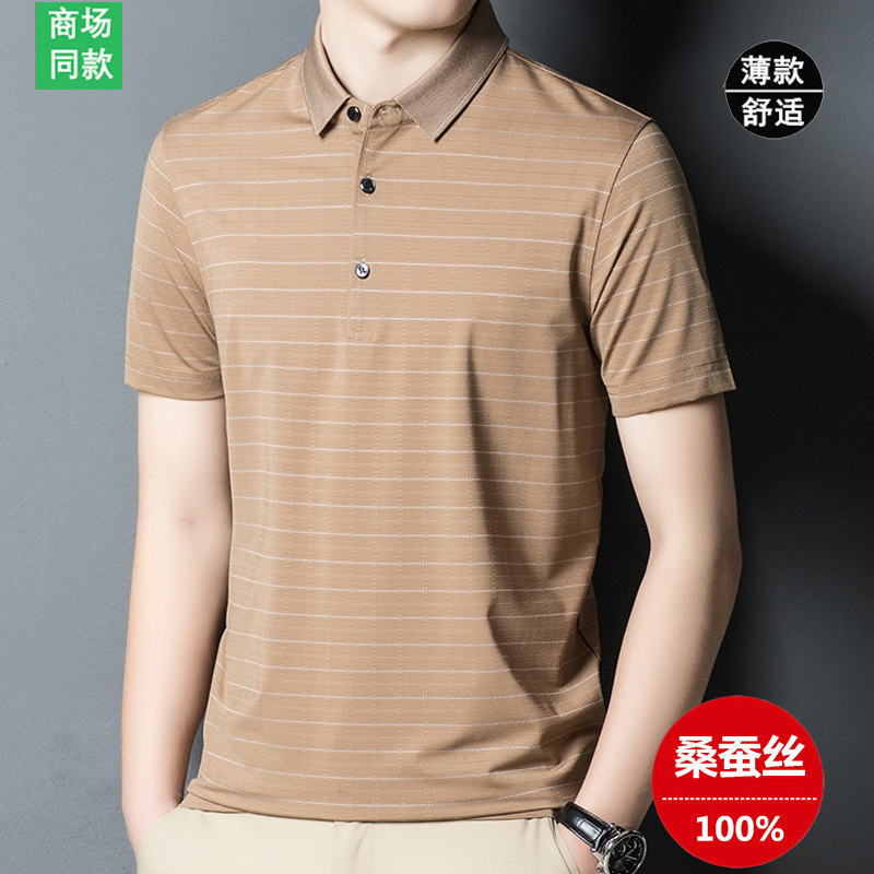 Spring bamboo 2021 mulberry silk short sleeve T-shirt Male middle-aged Dad Dress Striped Ice Silk Summer Men Half Sleeve T-shirt