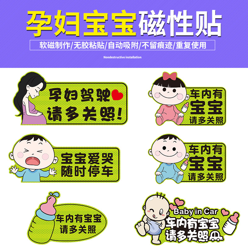 A-pregnant woman driving-Magnetic patch B-red car with baby-magnetic sticker C-baby love cry-Magnetic patch D-blue car with baby-magnetic sticker E-bottle in bottle with baby -