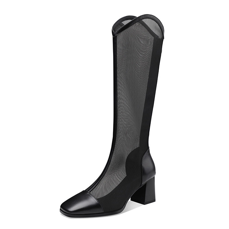 Great East Long boot ladies however knee-high heel mesh boots hollowed-out high cylinder cool boots Fashion square head genuine leather sandal mesh yarn