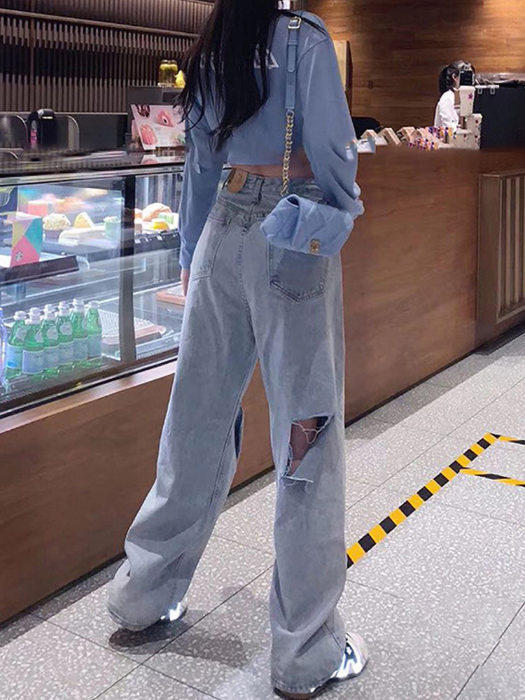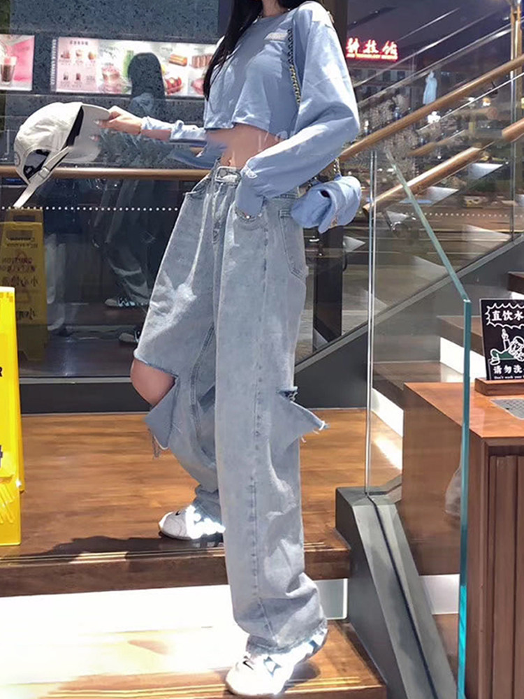 Large size women's pants Fat sister mm high waist display slim width leg pants loose Hole Pants Woman Hot girl Jeans Big Hole Exaggeration
