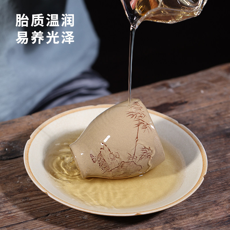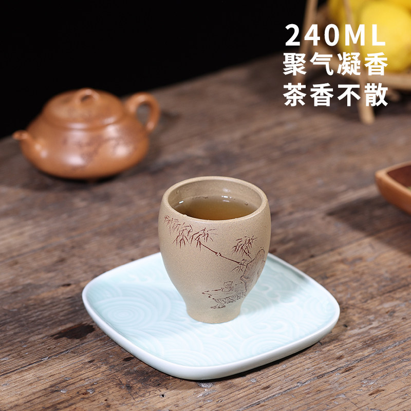 Runpu famous works Gu Youfen Bamboo and stone carved painted cup Benshan green clay master tea cup 238cc