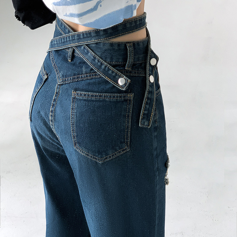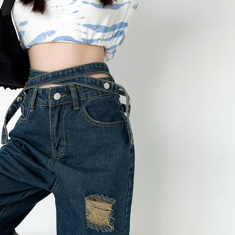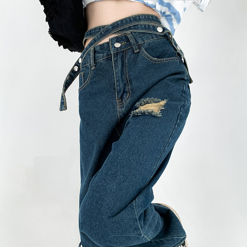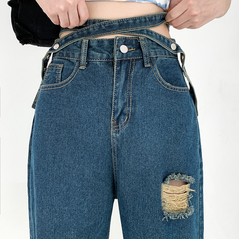 Hot girl high waist straight tube ripped denim women's pants fat sister plus size women's autumn clothing new 2022 loose and thin trendy