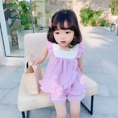 Girls foreign style Plaid lace set 2021 children's summer new Korean version of female baby vest shorts two-piece set