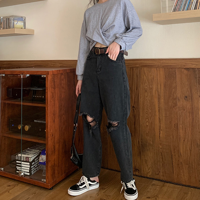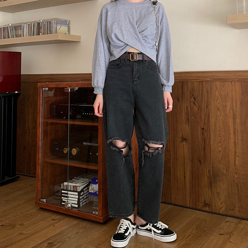 Big size Fat younger sister mm Pants slim 100 hitch Jr. Coarse Broken Hole Pants Woman Hot girl Loose Broadleg 90% Pants