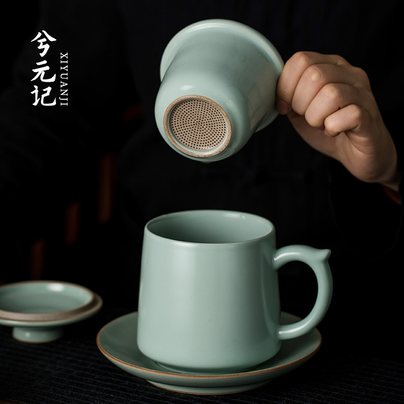 Ru kiln open piece can raise tea cup Home ceramic filter tea water separation Tea cup Office personal cup