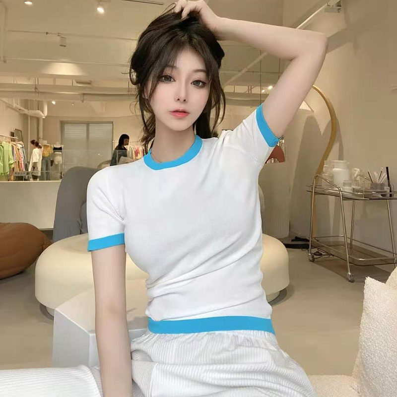 Small fragrance repair slim knitting shirt in 2022 new collision striped short sleeve coat tide