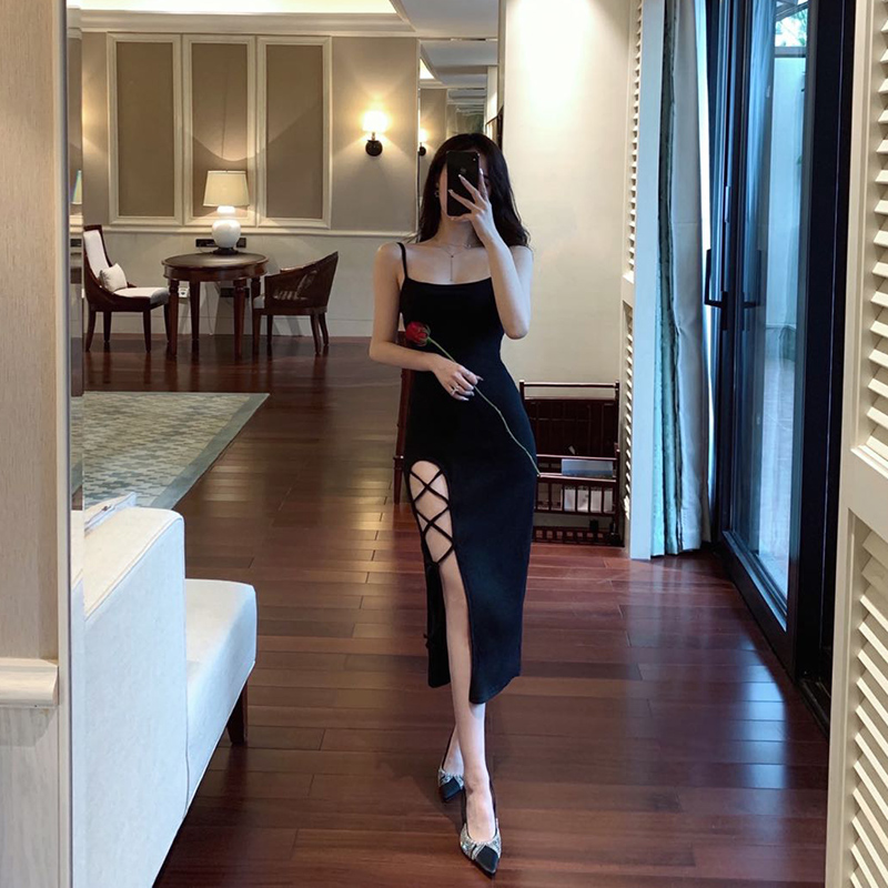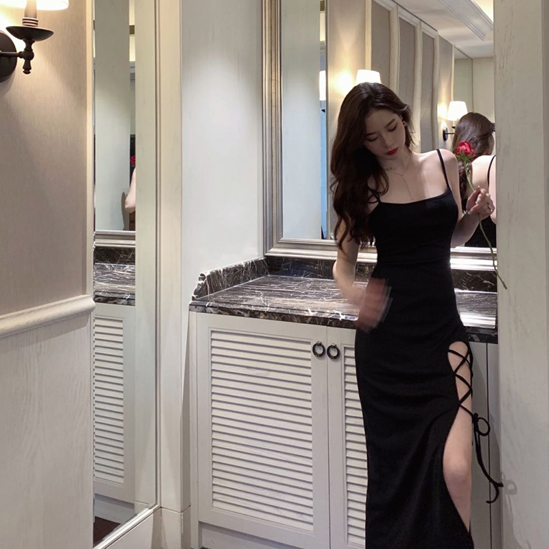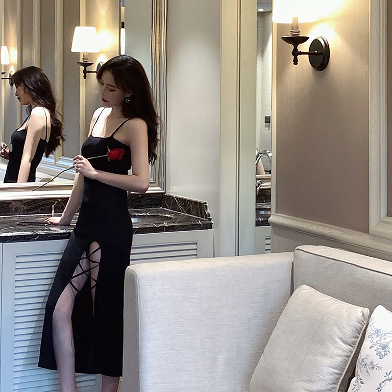 Summer wearing female high waist temperament appears thin medium and long skirt sexy shoulder leak back cross tie skirt