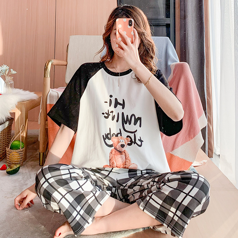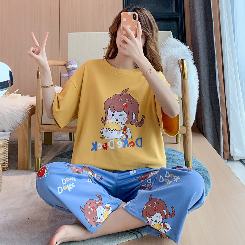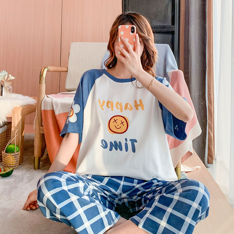 Step up plus obesity mm pyjamas pure cotton female summer Home Clothing Summer Thin short sleeves Long pants loose with large size 200 catty-Taobao