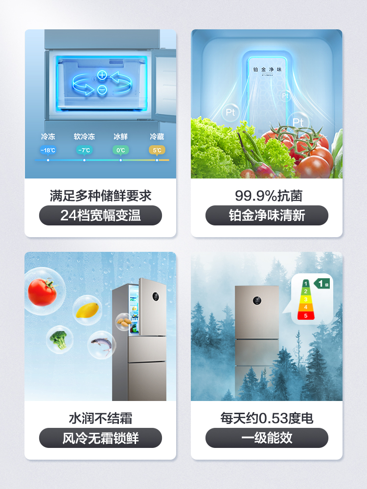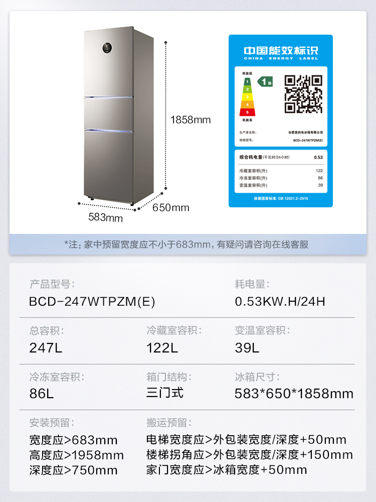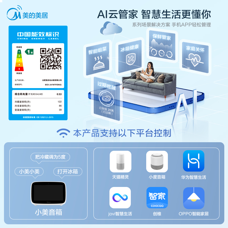 Midea 247-liter three-door intelligent refrigerator household medium-sized air-cooled frost-free small refrigerator first-class energy efficiency frequency conversion