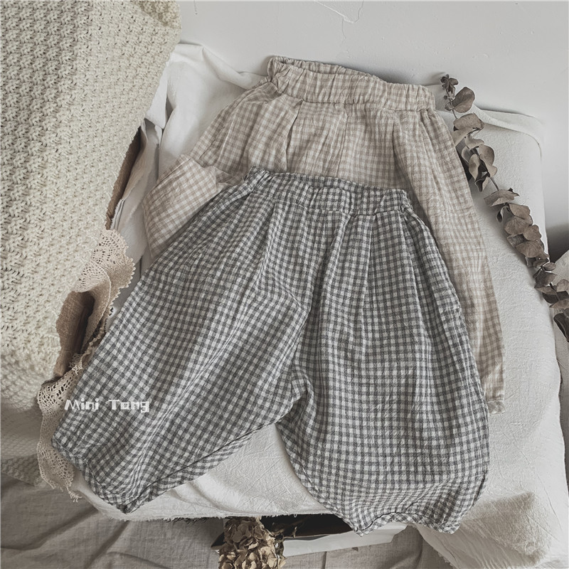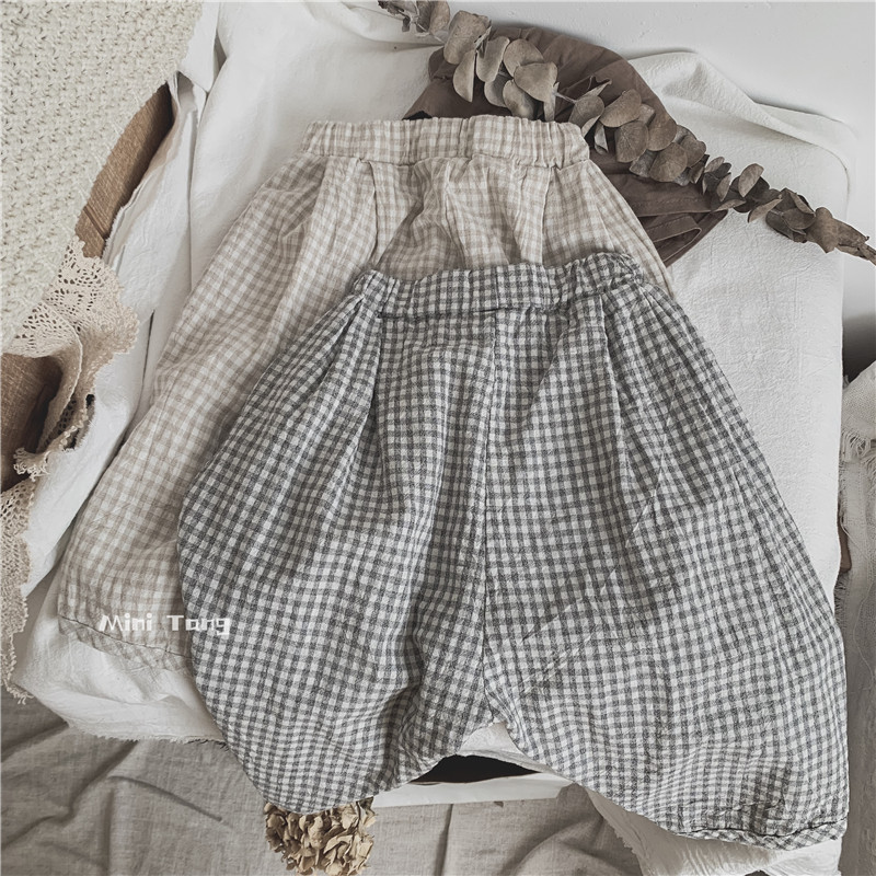 Department of Mori Art Fan ~ Summer Baby Lanterns Pants Children Plaid Practical Cotton Linen children Roof pants 7 Sub-pants