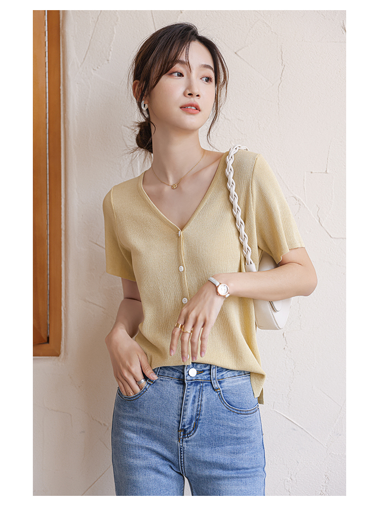 Ice silk v-neck short-sleeved t-shirt women 2022 spring and summer new thin section loose drape white short knitted cardigan top