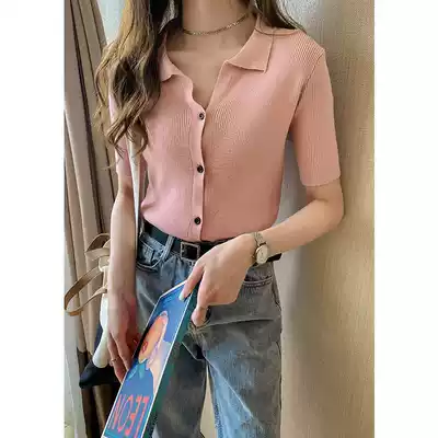 Light mature lazy polo collar ice silk sweater women's short sleeve 2021 spring and summer new coat loose pullover base shirt
