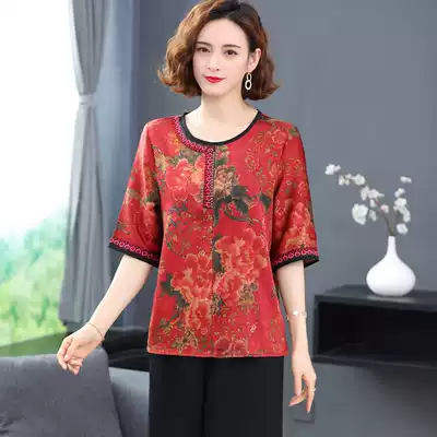 Heavy silk embroidered jacket women loose large size middle-aged and elderly mother clothing summer high-end mulberry silk T-shirt t