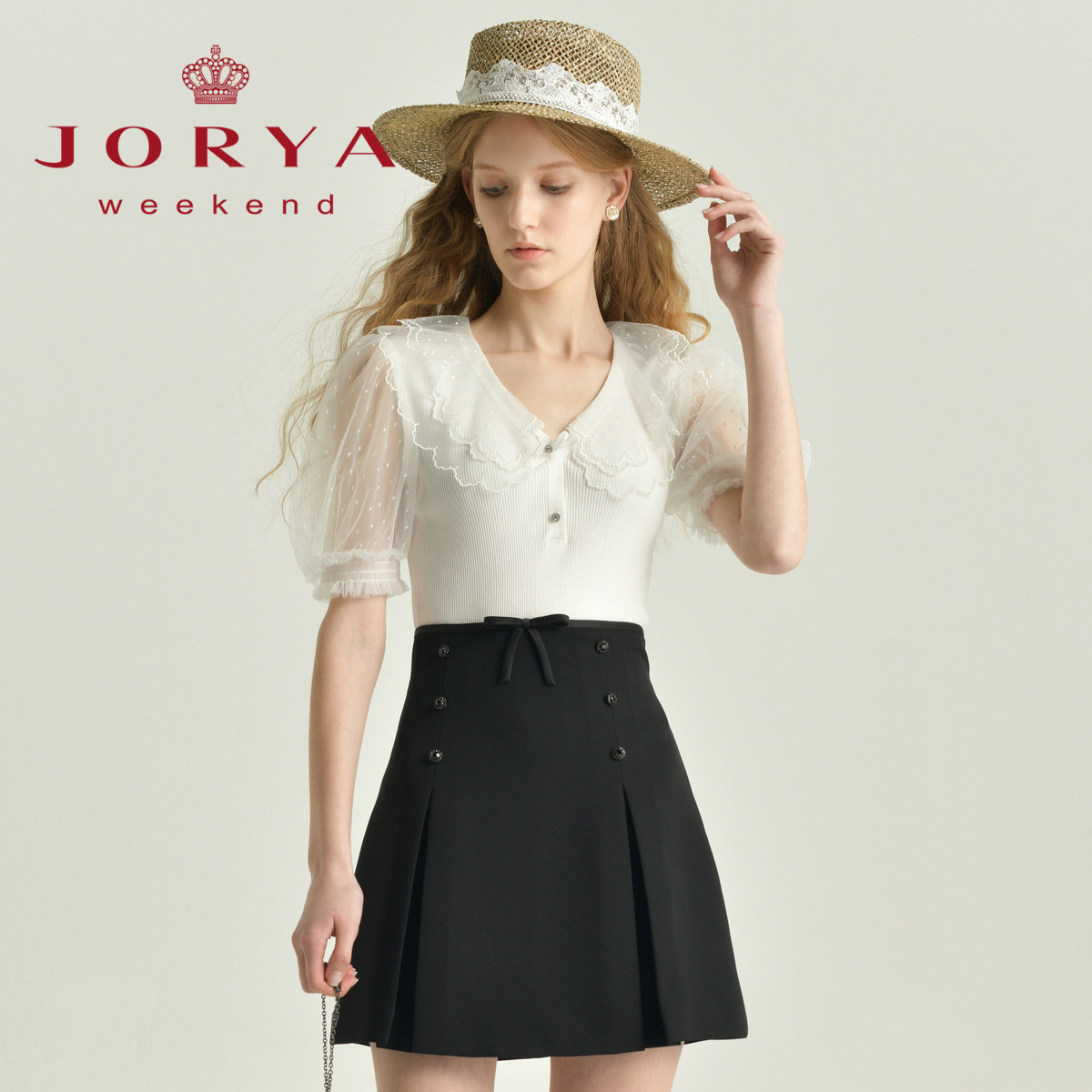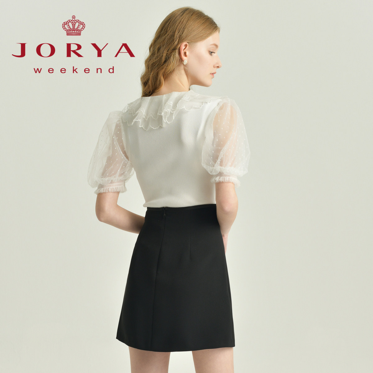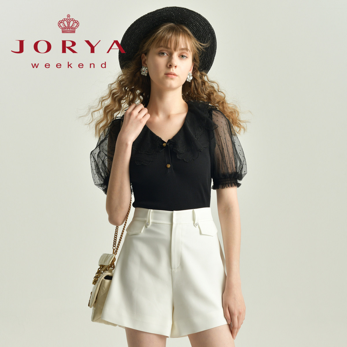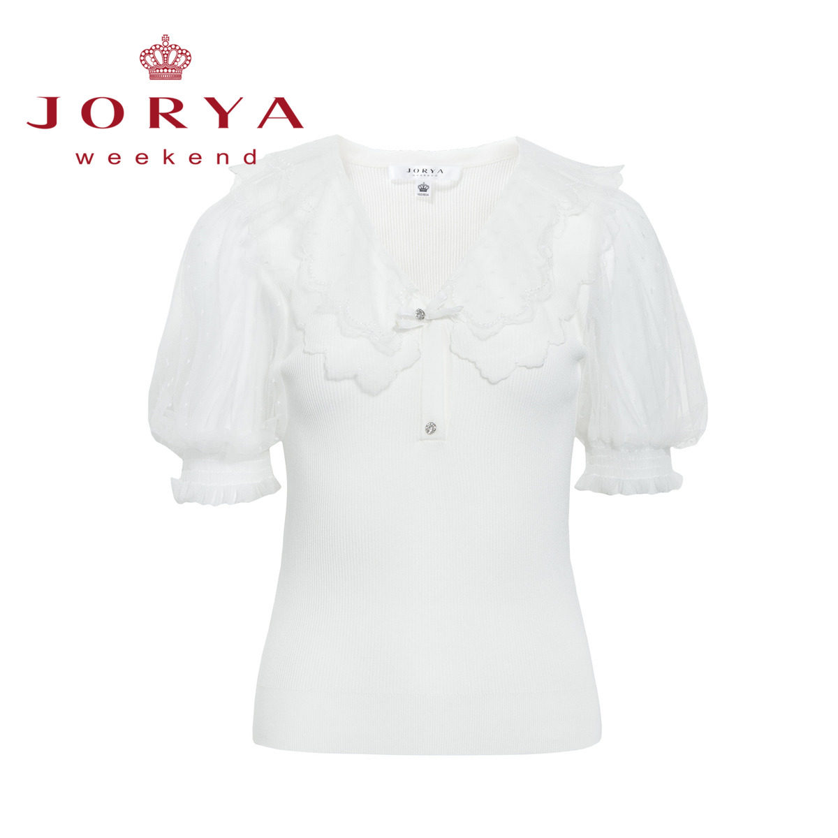 Zoya Weekend 2022 Summer New V-neck Lace Hook Flower Puff Sleeve Slim Rib Knit Sweater EJWBBQ76