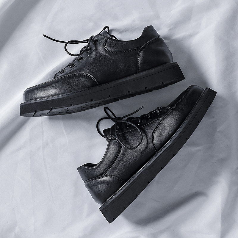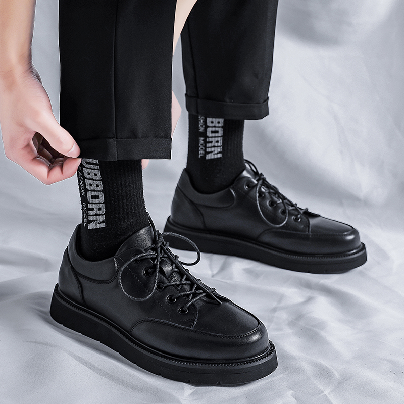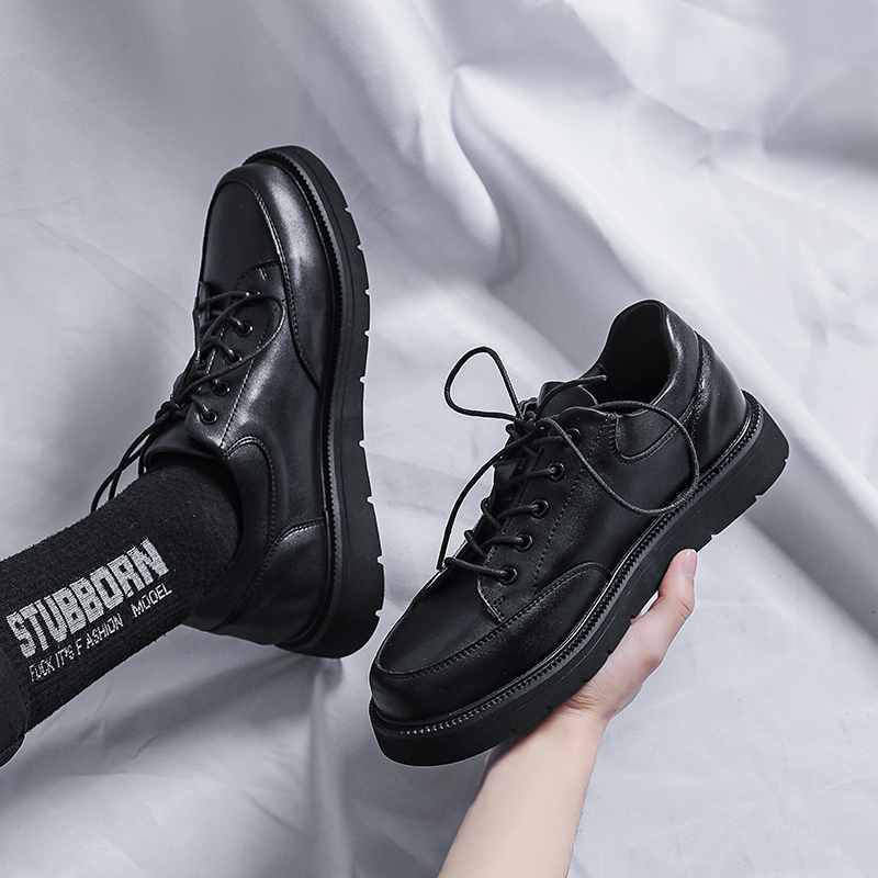 Casual shoes men's spring and autumn models inner heightened leather thick bottom round toe British style youth black sports small leather shoes men
