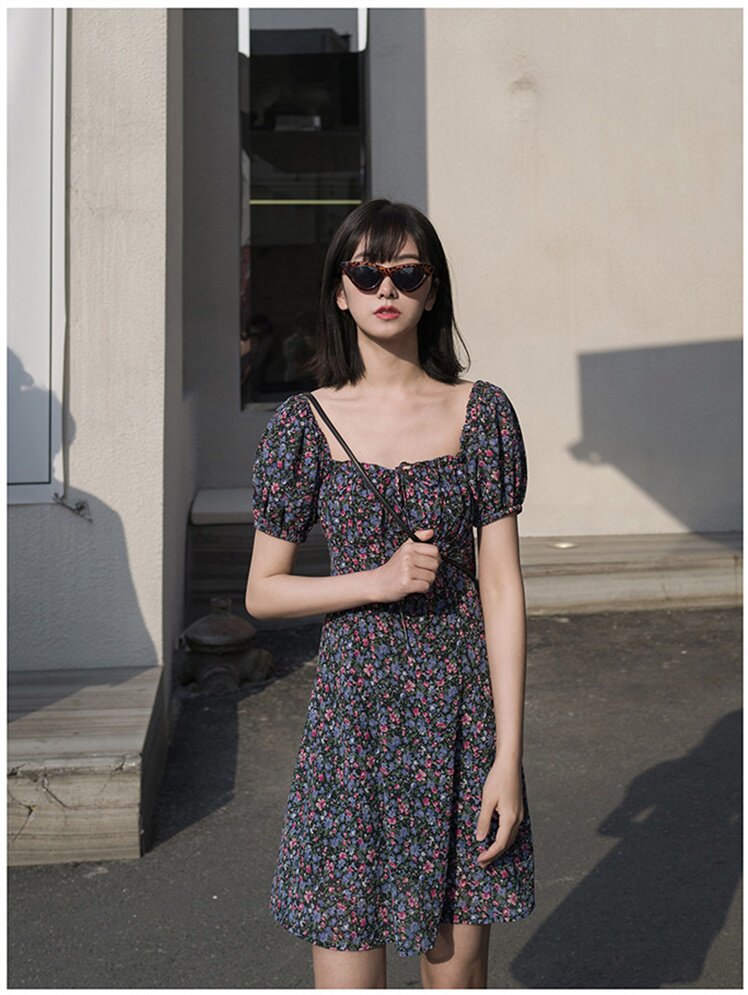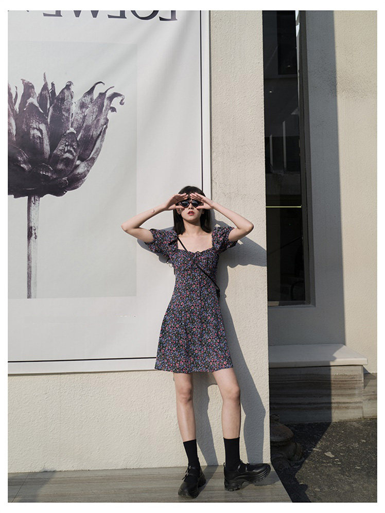 Spring and summer small people are tall and thin, high-waisted French square-neck puff sleeves, short a-word floral dresses, women