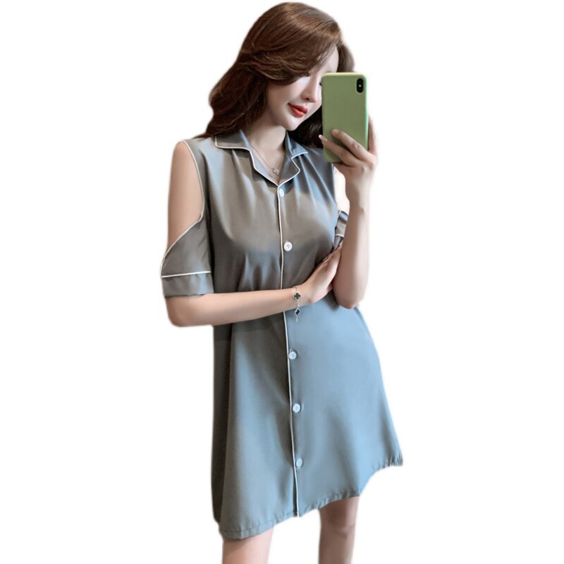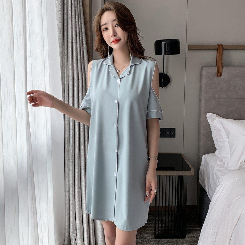 White shirt pajamas high-end women's short-sleeved summer ice silk nightdress off-the-shoulder sexy silk small thin section